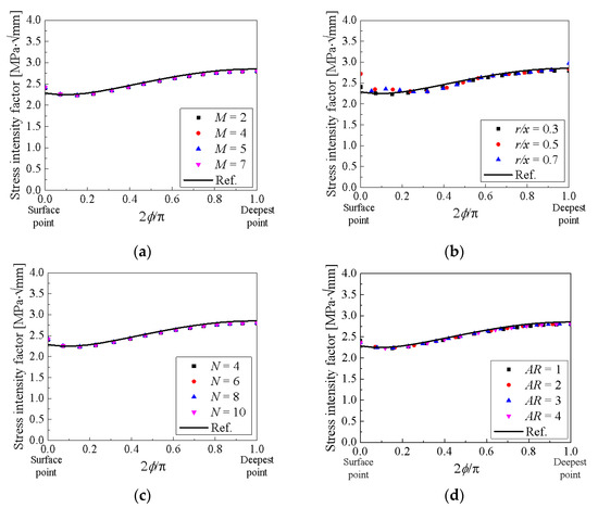 Comparison of SIFs according to crack tip mesh shape variables: (a) The number of elements in the radial direction of the contour (M); (b) The ratio of the relative contour size to the crack size (r/x); (c) The number of elements in the circumferential direction inside the contour (N); (d) The ratio of the total length of the crack tip to the radial size of the element (AR) [22].
