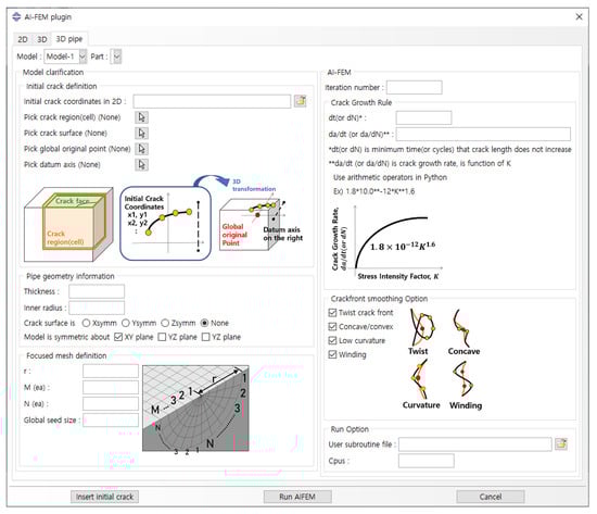 The first step in AI-FEM is to define the shape of the structure. This program can consider 2D/3D flat plate and 3D pipe models, and the shape can be determined from the upper menu of the GUI in Figure 8. Once the structure shape has been determined, the detailed characteristics of the structure and crack tip mesh should be defined. The submenus consist of pipe geometry information, model clarification, and focused mesh definition.