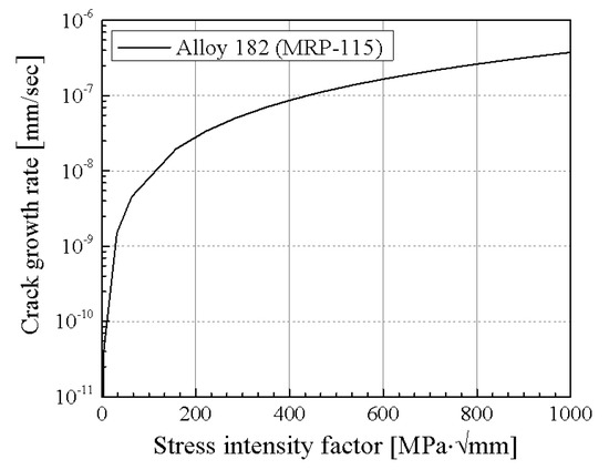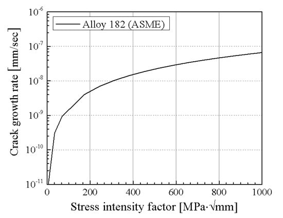 In the MRP-115 report [24], crack growth curves for Alloy 182 in the SCC environment are presented and are shown in Figure 13. The relation is as follows in Equation (8):