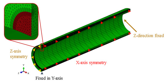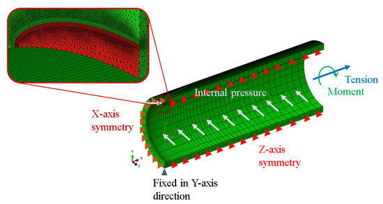 To compare the final crack size calculated through the ASME method and AI-FEM, FE models were prepared as shown in Figure 12. The length of the pipe was set to 5 times the inner diameter to prevent the effect of the length. Considering the symmetry of the pipe and crack shape, the FE model was created as a 1/4 model. In order to obtain an accurate SIF value, a model was created by applying the guidelines suggested in Section 2.2. For the crack tip mesh, the shape variables determined in Section 2.2.6 were used, and the QUA and tied options were not applied. C3D20R element was applied as an element type. As a boundary condition, a symmetrical condition was applied to the symmetrical surface except for the crack surface, and one point was constrained in the Y-axis direction to avoid unnecessary movement of the pipe. Also, the end face of the pipe opposite to the crack surface restricted movement in the z-axis direction. The FE models were applied to the AI-FEM to calculate the final crack size.