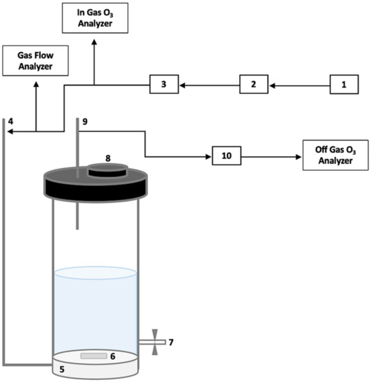 A semi-batch ozonation reactor: (1) oxygen gas and flow rate gauge, (2) air drier and humidity indicator, (3) O3 gas generator, (4) O3 gas input, (5) O3 gas diffuser, (6) magnetic stirrer, (7) sampling port, (8) solution input, (9) O3 gas output, (10) dryer for O3-saturated air.