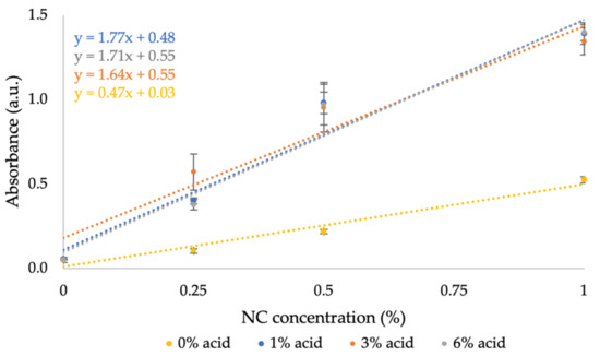 The absorbance of pure NC in varying sulfuric acid solutions was examined according to Section 2.2. Figure 3 demonstrates the relation between absorbance and NC concentration in varying sulfuric acid solutions at λ = 400 nm, based on Figure A1 in Appendix A. In the visible range, NC absorbance increases with concentration, and the absorbance of sulfuric acid remains similar to the control measurement of DIW (i.e., 0% acid). The absorbance of NC increases with the presence of sulfuric acid. Obtaining a similar slope for different acid concentrations (>0%) indicates that acid concentration does not affect the signal; only its presence does. This result is reasonable as sulfuric acid modifies the NC’s surface during their reaction, which increases the NC’s absorption overall. The signal remains proportional to the concentration of NC only.