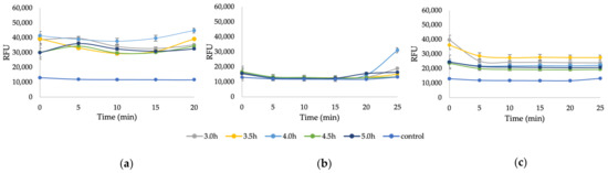 The RFU of Whatman filter paper after 0–3 h of 64% sulfuric acid hydrolysis at 45 °C (a) before centrifugation, (b) after one centrifugation (6000 rpm, 15 min), and (c) after two centrifugations (6000 rpm, 15 min); 0.4% KOH (pH = 13), 0.1% CFW.