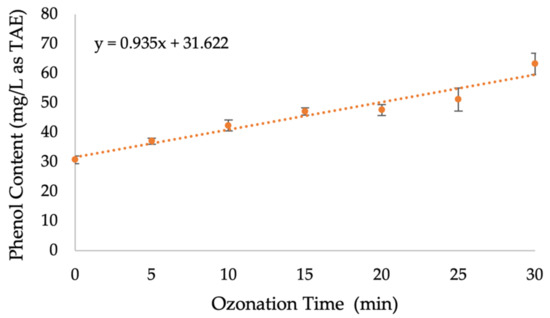 Figure 6 demonstrates an increase in the total phenol content released from RPS with ozonation time. This increase suggests that phenolic content is quickly released, exposing the cellulosic content of RPS. The hypothesis of lignin depolymerization during ozonation is strengthened. The ozonation duration is crucial not only for the efficiency of delignification but also for preventing further degradation of the exposed cellulosic content; long ozonation treatments might result in the degradation of soluble phenolic compounds as a result of oxidative chemical changes, which either mineralize the phenolic compounds or oxidize them to organic intermediates [69,70].