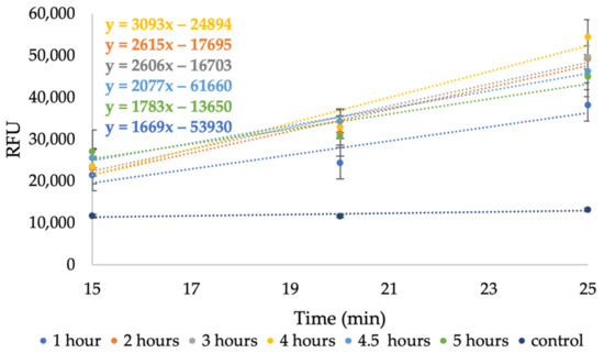 The RFU signal increase rate for 1–5 h hydrolysis between 15–25 min of testing.