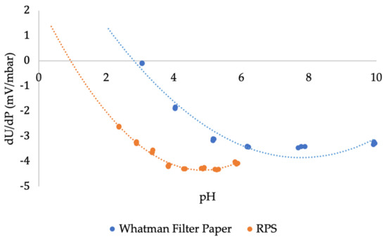 Streaming potential coupling coefficient (dU/dP) of Whatman filter paper and RPS. Dashed lines represent an extrapolation simulating the isoelectric point (IEP).