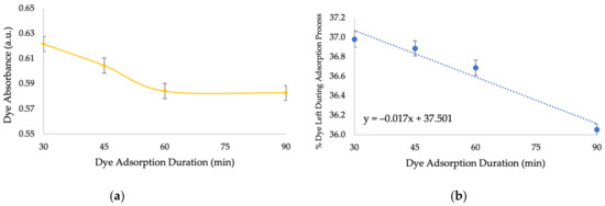 Figure 10 demonstrates the decrease in acid red 131 dye’s absorbance over time when it is mixed with crude NC for 30, 45, 60, and 90 min (Section 2.10), which indicates dye adsorption, and the content of dye during the adsorption process, which was calculated using a calibration curve (Figure A7b in Appendix A). After 30 min of constant mixing, 37% (0.037 mg/L) of the dye remained in the solution, meaning that 63% (0.063 mg/L) was adsorbed. The dye’s absorbance signal did not change considerably during the remaining reaction time and reached a plateau after 60 min.
