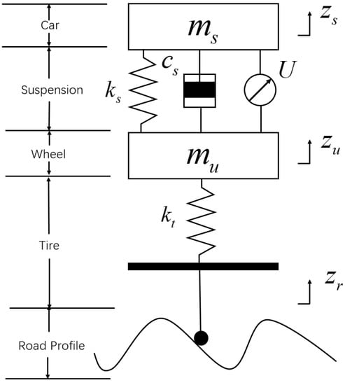 The suspension system is affected by many factors, and correspondingly, there are models of suspension systems with complex and diverse degrees of freedom. The two-degree-of-freedom suspension is the most refined structure in the field of automotive suspensions, which can meet the basic requirements of vibration control studies for different levels of roads by intuitively responding to the vibration of a single tire. In this paper, by studying the control strategy of the 2-DOF suspension model, the advantages and disadvantages of the control method can be roughly judged, and the system structure and calculation are relatively simple, which is the basis for the study of the control system of the full vehicle []. The 2-DOF quarter semi-active suspension system model is shown in Figure 1.