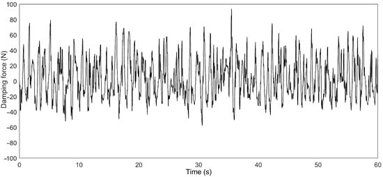 According to the above process, the road information is input into the suspension system by using sensors to obtain the corresponding suspension response performances. In this paper, the response indicators of the suspension system were selected as the body acceleration, suspension deflection, and tire dynamic load, and the three performance indicators were used as the state space S input for reinforcement learning; the action space A output is the damping force of the suspension system; considering the practical application of the suspension system, the range of the damping force was set to −500 N to 500 N. Figure 3 shows a change in the damping force of the semi-active suspension. The resulting response performance is input as the state space into the policy network of the PPO algorithm.