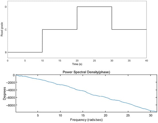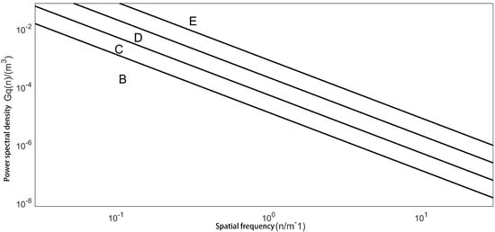 The suspension performance of a vehicle is affected by many factors, including the roughness of the road. According to the international ISO 8608 standard [], special index data are used to describe the characteristics of the road, and the establishment of a frequency domain road model is mainly based on the actual measurement of the road information, including road unevenness. The road roughness can be divided into eight classes, as shown in Table 1, which specifies the upper and lower limits and average values of the corresponding road spectrum for each road class.