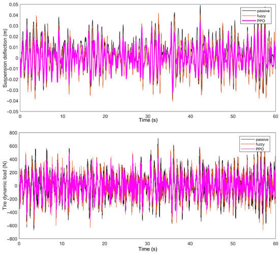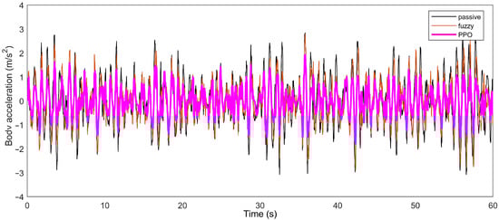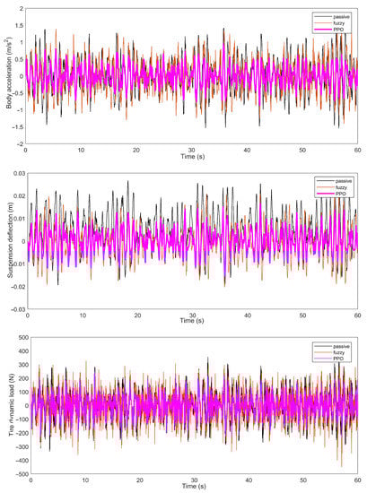 The simulation experimental results of the body acceleration, suspension deflection, and dynamic tire load on C-class and D-class roads at a vehicle speed of 20 m/s are shown in Figure 6 and Figure 7. For the ease of comparison, the percentages of the root mean square (RMS) values for the body acceleration, suspension deflection, and tire dynamic load of the passive suspension, the semi-active suspension system based on fuzzy control, and the PPO algorithm under the same conditions are given in Table 5, and the corresponding root-mean-squared error (RMSE) values are given in Table 6.