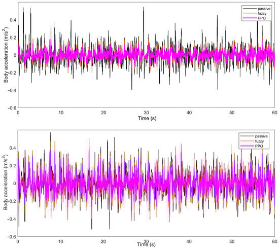In order to test the adaptability of the control strategy proposed in this paper to different vehicle models, simulation experiments were conducted for a heavy vehicle on B-, C-, and D-class roads by changing the vehicle speed to 15 m/s according to the actual situation, and the suspension parameters and road power spectrum are shown in Table 3 and Figure 5, respectively. Figure 8 shows the simulation results of the body acceleration on B- and C-class roads. The percentages of the RMS values of the body acceleration for the passive suspension and the semi-active suspension system based on the fuzzy and PPO algorithm under the same conditions are given in Table 7, and the corresponding RMSE values are given in Table 8. The experimental results showed that the PPO-based semi-active suspension system still had good performance under different vehicle models, vehicle speeds, and road conditions.