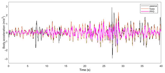 In order to verify the applicability of the proposed control strategy to the case of the road level changing randomly, simulation experiments were conducted for a light vehicle at a speed of 20 m/s with continuous changes in the road grade, and the road surface changes and body acceleration are shown in Figure 9 and Figure 10. As shown in Figure 9, the road changed from Class B to Class C, then to Class D, and finally, back to Class C. The duration of each section was 10 s, and the total simulation time was 40 s. According to the simulation experiment results in Figure 10, it was proven that the semi-active suspension system based on PPO still had good performance under the continuously changing roads, and the body acceleration value was reduced by 46.93%.
