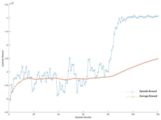 This paper used the PPO algorithm for training. The max episodes was set to 10,000. The max steps per episode was set to 600. The sampling time was 0.1 s. The time per iteration was 60 s. The mini batch size was set to 64. The convergence process of the algorithm is shown in Figure 11, which tended to converge at 90 episodes according to the figure, with a total time of about 1.2 h, and it took a short time from the beginning of the algorithm to search for good behavior to the final convergence, which was faster than the number of iterations of the particle swarm optimization (PSO) algorithm in the paper [].
