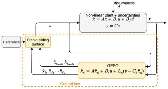 where = are the estimates of the state variable , is observer gain matrix with dimension , which has to be design, and is an estimation of lumped disturbance d. The GESO simultaneously provides an estimate of the states and the uncertainties, as the uncertainties are part of the states of the extended order system [].