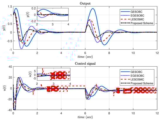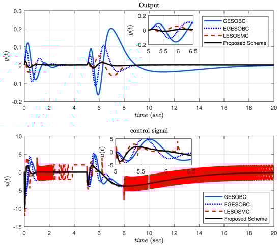 A comparative study has been carried out to show the efficacy of the proposed controller. In Example 1, EGESO based SMC is compared with other control techniques [,]. The proposed controller is also applied to Example 2, an uncertain, unstable system with minimum phase zero, and the results are compared with other techniques. Finally, the proposed controller is validated with other controllers on SLFM actuated by DC motor. Mismatched disturbances are introduced in all cases and removed actively from the output with the help of the proposed control law.