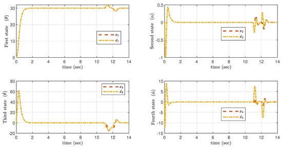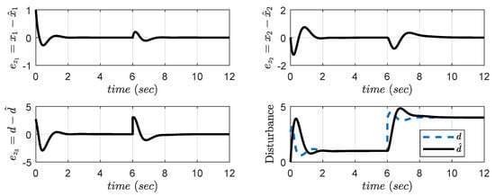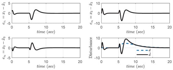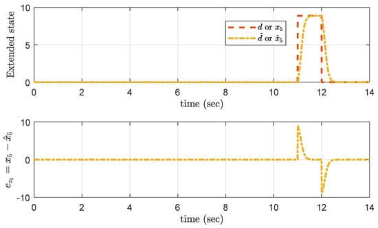 The actual and estimated states are , , , given in Figure 13. It is observed that GESO properly measures the estimated states, whereas the extended state estimates disturbance acts on the system immediately. The estimation of disturbance and error in disturbance estimation (error dynamics) are shown in Figure 14.