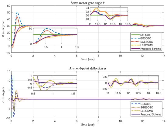 where the sliding surface coefficient , observer gain obtained as [51.81 −27.2945 −146.3584 −245.1937 234.7045 743.9036], , step size of simulation = 0.001 s, solver used in simulation is ode4 (Runge–Kutta). The proposed controller response is compared with other methods, and set-point tracking of and arm end-point deflection angle () are observed as shown in Figure 10. It is found that the proposed controller is not giving any overshoot as compared to the other two methods, so its effect on seems to be very less.