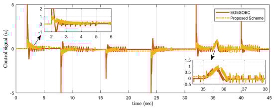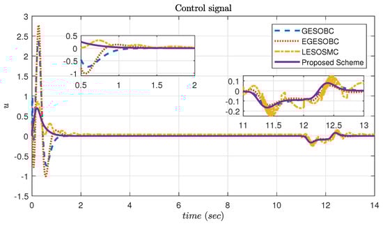 From the performance indices shown in Table 4, it is clarified that the proposed controller provides a minor error compared to other techniques in all cases. It is observed that the proposed scheme improves the control performance by reducing efforts of dc motor to 12.47%, 0.78%, and 65.80% as compared with GESO based method [], EGESO based method [], and Linear extended state observer-based sliding mode control (LESOSMC) [] method respectively.