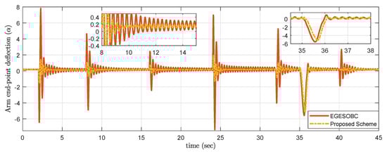 In order to stress the effect of the difference in real-time control efforts, multilevel fixed set-points trajectory with disturbances is adopted. The servo motor gear angle for the selected trajectory is shown in Figure 15. On the zoomed portion, the proposed controller offers a smooth response without overshoot as compared to other techniques, which leads to less chattering in . Furthermore, it was also considered to have the desired requirement of less arm end-point deflection , and it is observed that the proposed scheme works effectively to satisfy the desired requirement in Figure 16.