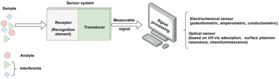 Generally, a sensor is composed of three integrated parts (Figure 1), as follows: (i) a receptor for detecting the target analyte in a selective and sensitive manner, (ii) a physical transducer that converts the information obtained from the sensitive receptor into a measurable signal (usually an electric signal), and (iii) a suitable analytical device to process and show the significant signals formed by transducers and to calculate the results [4].