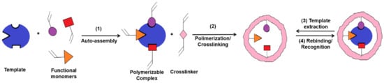 MIPs are polymeric materials that are designed and produced with built-in molecular recognition properties. As a result of this fundamental attribute, a growing interest has been observed in their development as inexpensive and robust materials with sensitive and selective molecular recognition. Some of the top current applications that include the use of MIPs are associated with catalysis, separation sciences and monitoring/diagnostic devices for chemicals, biochemicals and pharmaceuticals [6,7]. MIPs have proven to possess important advantages as an alternative sensing material for biosensors, including the ease of preparation, storage stability, low cost, repeated uses without loss of activity, high mechanical strength and resistance to heat and pressure as well as to harsh chemical environments [8,9]. In a typical approach, the MI process (Figure 2) allows the creation of specific molecular recognition sites by the polymerization of a functional monomer in the presence of target molecules (called template) and of a high concentration of crosslinker. Following the template removal, by specific extraction procedures, the specific recognition cavities are revealed [10,11,12].This approach endows MIPs with tremendous specific binding properties, as they possess cavities with complementary size, shape and electronic environment with the target molecule [13].