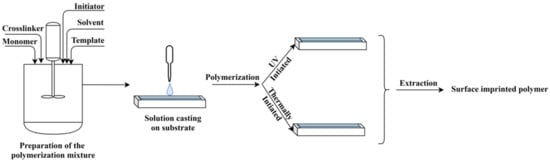 In principle, the method consists of the preparation of a polymerization mixture, containing the functional monomer, the template, the initiator, the porogen solvent and the crosslinker, similar to the bulk method (see Figure 3). An amount of this mixture is cast on a solid surface, as for instance the sensor surface, and the formed thin film is polymerized thermically or by UV light curing; the latter being largely preferred. At the end, the template is extracted, thus generating the surface imprinted polymer [16].