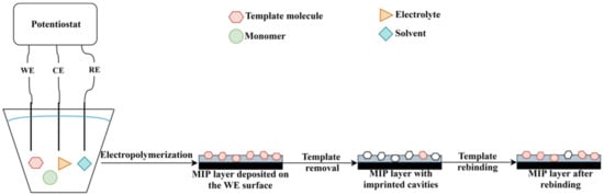 The electrochemical polymerization can be carried out using a three-electrode system (working electrode, counter electrode and reference electrode) or screen-printed electrodes (“3 in 1 electrode”). In a typical procedure, the following components are required: electrode system, solvent, supporting electrolyte, monomer(s) and template molecule (in case of MIP synthesis) [64]. The polymer layer deposition takes place on the working electrode (WE) surface (given schematically in Figure 4). The most common electrodes are made of gold, carbon and platinum, but other options are also available such as silver or indium tin oxide. Since, the properties of the polymer film are influenced by the electrode material, electrode surface, supporting electrolyte, electropolymerization technique, solvent and monomer, the overall procedure usually requires an optimization [65].
