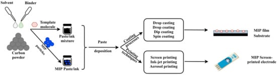 This section brings to the scientific community newsworthy studies through reviews and original articles concerning strategies for preparing pastes or inks, used for the fabrication of molecularly imprinted polymers (MIPs)-decorated layers or films. Currently, preparation of sensitive layers on electrode surfaces is certainly the most frequently used technique for MIP-modified electrodes. Among the reviewed methods for forming MIP layers, dropcasting of a pre-prepared polymer paste and coating processes such as drop/dip or spin coating and screen printing, or through self-assembled monolayers (SAMs) [94] are shortly discussed hereafter. Hence, this part of the review focuses more on the performances of the resulting MIP-modified layers via their preparation and deposition techniques.
