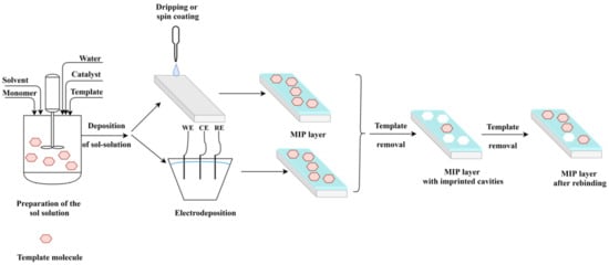 MIPs can also be used to design enzymatic and immunoaffinity sensors. In agreement with the classification of biosensors, MIP-based devices can work according to two different detection schemes: (1) affinity sensors (“plastic antibodies”) and (2) catalytic sensors (“plasticenzymes”) [2,23]. In this respect, MIP layers are usually deposited directly on the transducer surface of a sensor chip to produce the recognition unit [24,25]. As a result of this rather simple procedure, many researchers have found various methodologies for producing MIP layers as receptors for producing sensing devices, such as spin coating of a precursor solution to form a thin film, followed by insitu chemical polymerization [26]; electropolymerization of a pre-assembled complex of an electroactive functional monomer with a template [27,28]; dropcasting of a precursor polymer from solution [25,29,30]; dripping a composite solution containing a conducting material (e.g., graphene), MIP particles, and a binder (e.g., PVC) [31]; and, self-assembly of monolayers [32]. Thereby, the target of this review is to present both modern and dedicated methods for the preparation of MIP-sensitive layers, which are presented in detail in the next sections. In all cases, the authors describe the synthesis procedure and properties of prepared MIPs, giving quantifiable results relative to the control samples, non-imprinted polymers (NIP).