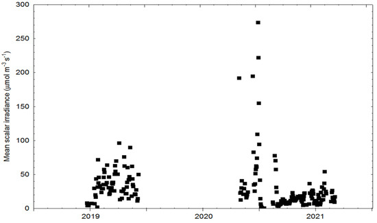 - Agustí, S. Light environment within dense algal populations: Cell size influences on self-shading. J. Plankton Res. 1991, 13, 863–871. [Google Scholar] [CrossRef]