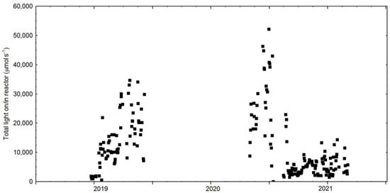 - Huang, J.; Hankamer, B.; Yarnold, J. Design scenarios of outdoor arrayed cylindrical photobioreactors for microalgae cultivation considering solar radiation and temperature. Algal Res. 2019, 41, 101515. [Google Scholar] [CrossRef] [Green Version]