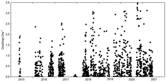 | g L−1 day−1 | Doublings day−1 | L | ||