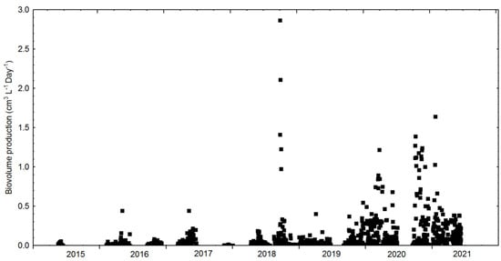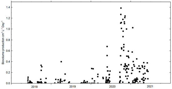 | Production with cells < 30 μm ** | 0.219 | 0.327 | 102 | cm3 L−1 Day−1 |