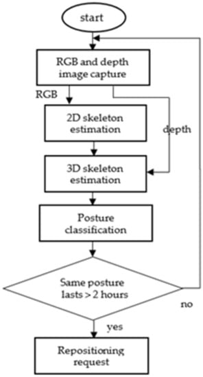 In contrast to image-based methods, some other studies used skeleton-based algorithms for posture/action recognition. Lee et al. [23] proposed to use 3D skeleton from Kinect V2 for sleep pattern monitoring. However, the subjects for the test were not covered with blankets, so that 3D skeletons could be constructed from the depth images. Recently, deep-learning algorithms were developed to estimate human skeleton (a set of articulated 3D joints) from a single RGB image [24,25,26,27] to avoid the influence of inaccurate depths and for outdoor use. This kind of 2D skeleton and 3D skeleton was used in [28,29] for fall detection and gesture recognition, respectively.
