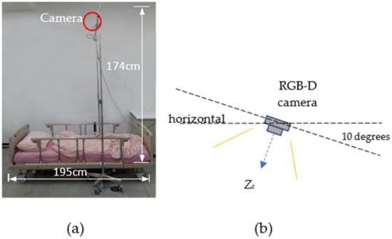 Figure 2 shows our system setup, where an Intel Realsense RGB-D camera was mounted above the bed at a height of 174 cm with a viewing angle of 10 degrees with respect to the nadir point. Practically, the camera can be mounted on a track above the bed, with a suitable height and tilting angle, so as not to interrupt the working of the caregivers.