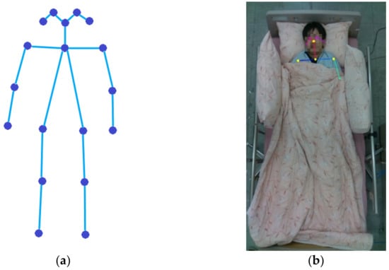We use the OpenPose [25] tool, which is advantageous in speed performance and robustness to joint occlusions. OpenPose is not restricted to the detection of a full skeleton, but all visible or perhaps some occluded joints can be detected. However, only four joints (nose, neck, left shoulder, right shoulder) will be used for posture classification in the proposed system. Figure 3 illustrates for OpenPose (a) the complete skeleton model and (b) an example of 2D skeleton extracted for a sleeping person covered with blanket.