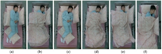 Since the elderly patients were mobility-compromised and suffered from muscle atrophy, the repositioning for them was realized by placing pillows on specified locations which are very different from those defined in fetus/log/yearner positions in [21,23]. To meet practical situations, we made some arrangements in collecting the dataset which were considered as the changing factors and are listed in Table 2. As a result, 162 samples were recorded (54 samples for each posture with blanket covering) for each volunteer subject. Figure 4 illustrates some captured samples for left-side posture in the dataset.