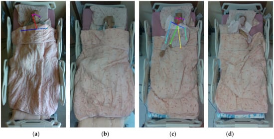- caregivers’ ways of bed sheets covering (e.g., a scarf/towel with a similar color which prevents correct OpenPose operation, nearly full covering of the patients’ shoulders by blankets);