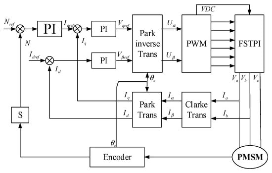 As shown in Figure 2, the voltage and the current of the PMSM can be transformed from the ABC coordinates to the d-q coordinates by using the Clarke transformation and the Park transformation. The encoder obtains the rotor position  for transformation calculation. The double PI controller is used to adjust the rotational speed. A PI speed controller is adopted in the speed loop, and a vector controller is used in the current loop. In the current loop, the Id = 0 method is used []. The voltage in the d-q coordinates can be transformed to  coordinates through the Park inverse transformation, generating the control signal to control the SVPWM controller. The SVPWM controller generates the SVPWM signal by using a three-phase inverter (FSTPI). In the d-q coordinates, the relationships of the motor voltage, current, and speed are as follows []: