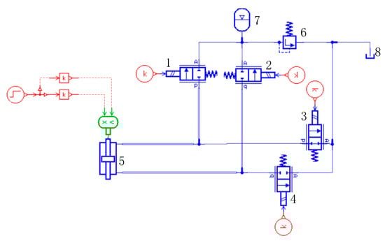 If electromagnetic valves 1 and 4 are opened and the electromagnetic valves 2 and 3 are closed, a spring-like load to the right will be output. While the electromagnetic valves 2 and 3 are opened and the electromagnetic valves 1 and 4 are closed, a spring-like load to the left will be output. The overflow pressure of the relief valve determines the upper limit of the spring-like force. Figure 8 shows the model of the hydraulic loading system in AMESIM and the component number in Figure 8 is the same as them in Figure 7.