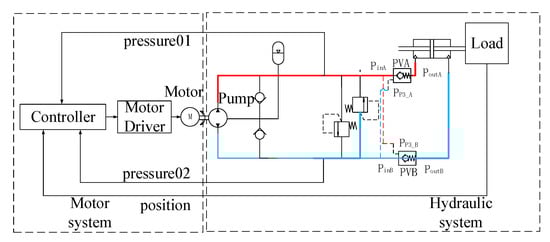 Figure 1 shows the BHL-EHA system structure. The EHA system consists of a motor, bidirectional gear pump, piston cylinder, fuel tank, check valve, an overflow valve, an electronic controller, a hydraulic lock, and an auxiliary component []. The position control of the piston-cylinder is realized by adjusting the motor’s speed and direction. The pump provides pressure and flows to the hydraulic system. The hydraulic lock is located at the front of the piston-cylinder in the hydraulic system. The position of the piston-cylinder is locked when there is no flow through the hydraulic lock.