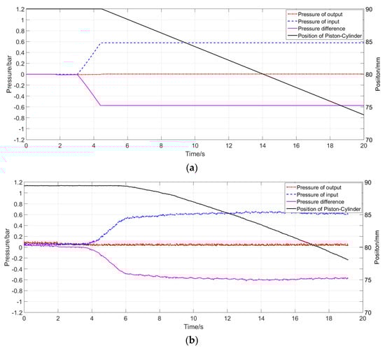 As shown in Figure 24, the opening time of the hydraulic lock is almost unaffected during spring-like loading. Hence, the delay of the position output of the piston-cylinder was almost unchanged. With the movement of the piston-cylinder, the pressure difference increased gradually. With the increase of the pressure difference, the movement speed of the piston-cylinder decreased gradually due to the leakage of the pump and the piston-cylinder. The spring-like loads will affect the dynamic characteristics of the position output, but it will not affect the delay. However, the damping-like load will affect the delay. That is because the piston-cylinder output hydraulic pressure must be greater than the damping (such as friction resistance) before it starts to move, while the spring-like load begins to increase after it starts to move.