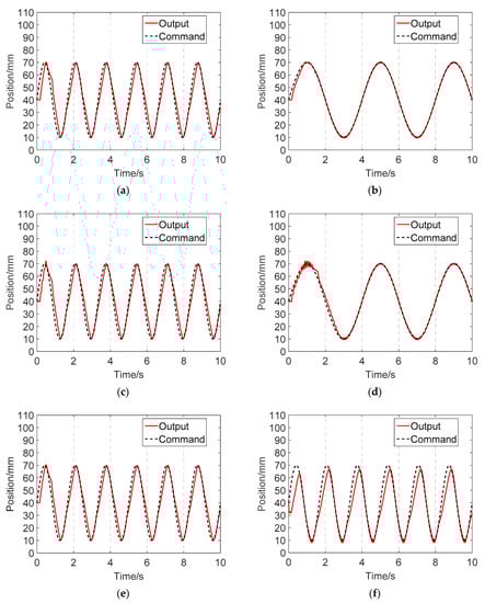 Figure 27f shows the result of the delay compensation control method when 5 MPa load is applied. According to Equations (32) and (33), with  unchanged, the increase of the damping-like load will increase . As a result, the load increases the delay. In the positive half cycle of the sine command, the load direction is opposite to the command. In the negative half cycle of the sine command, the load direction is the same as the command. Therefore, the positive half cycle tracking performance is weakened, while the negative half cycle tracking performance is enhanced. However, compared with the result without the compensation control method (as shown in Figure 19, even without load), it can achieve a good control effect. However, to improve the control effect, the controller should be modified according to Equation (33) when the load changes