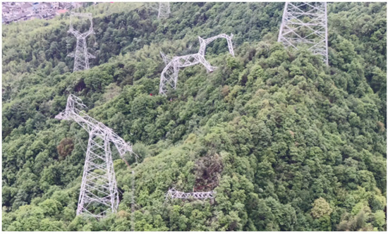 Downbursts, resulting in a high near-ground wind velocity, are recognized as a primary factor in most transmission tower collapse events [1,2], and have received much attention in wind engineering. Figure 1 shows several collapsed transmission towers, erected on hilly terrain, due to a severe downburst event in Shaoxing, China. In addition, concerns regarding downburst-induced wind loadings on other structures that are vulnerable to winds, e.g., long-span bridges [3] and rail overhead lines [4], have also been raised recently. Considering downburst effects on structures erected on islands, hills, or mountains, a large number of studies [5,6,7,8,9,10,11,12,13] utilizing various idealized hill models have been conducted in the past decades, and have reached a consensus that the aerodynamic interference of hilly terrain leads to a speed-up phenomenon, which a priori increases the risk of structural failure. Nonetheless, Abd-Elaal et al. [5] recently emphasized that the effects of topography on downburst wind fields require further research, as most studies have been limited to two-dimensional (2D) topographic features, and the changes in the vertical downburst wind speed component are not well understood.