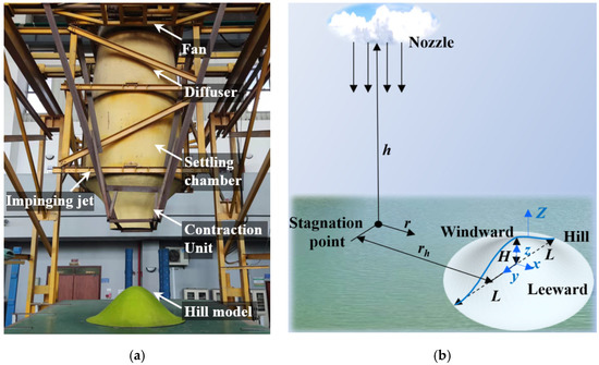 As shown in Figure 2a, the laboratory tests were conducted by using a physical downburst simulator in Zhejiang University. The impinging jet consists of four parts: a fan, a diffuser, a settling chamber, and a contraction unit [21]. In the tests, the jet diameter Djet was 0.6 m; the jet height h, from the ground to the nozzle, was set to be two times the jet diameter; r denotes the radial horizontal distance from the stagnation point. The temperature of the downdraft was the same as the indoor ambient temperature, ranging from 6 to 14 °C. A Cartesian coordinate system for the hill was employed and is illustrated in Figure 2b, with the origin set at the center of the hill bottom face, and where x and y are the orthogonal horizontal coordinates. Without loss of generality, the x-axis of the hill coincided with the radial direction of the jet flow. A cosine-squared cross-section was adopted to represent an idealized axisymmetric hill [22], in the form of