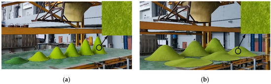 where L is the radius of the bottom face of the hill and z is the altitude of the point on the hill surface. Accordingly, Equation (1) yields L = 2Lu. Moreover, a local coordinate, Z, is used to denote the relative height from the surface of the hill. A total of 12 hill models, with parameters tabulated in Table 2, were employed in the laboratory tests to investigate the effects of the height, size, and location of the hill on the wind field above the hill. The hill models can be classified into two categories, namely the hill models with L = 0.5Djet and those with L = 1.0Djet. The hill models were made from rigid extruded polystyrene foam board. Assuming a scale of 1:1000 and an average vegetation height of 2.0 m, the vegetation was simulated by gluing 2 mm long plastic fibers onto the surface of the hill models (see Figure 3), according to previous work by Shen et al. [22], and the surface roughness of the hill models was approximately the same for all models. Figure 3 shows the hill models with the simulated vegetation. To examine the strong horizontal wind region, the hill models were first placed at three locations for the experimental study, namely rh = 0.8Djet, 1.0Djet, and 1.2Djet. For the next part of the test, the hill models were placed at rh = 0.0Djet, where a strong vertical wind would occur.