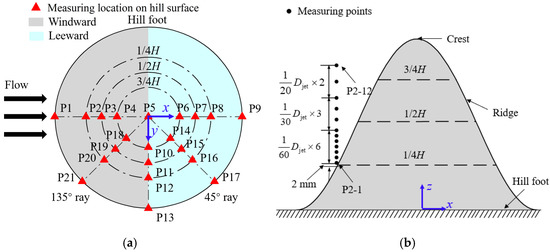 Taking advantage of symmetry, the wind velocity profiles at 21 measuring locations were measured. Figure 4a shows the measuring locations at the hill foot (0.0H), ridge (0.25H, 0.5H, 0.75H), and crest (1.0H), respectively. In this study, the ridge is defined as the profile of the hill model, where the crest and the hill foot are excluded, as shown in Figure 4b. The measuring locations were arranged at the ridges of the x-axis, y-axis, 45° ray, and 135° ray, respectively, namely at the ridges whose projections on the x–y plane coincide with the x-axis, y-axis, 45° ray, and 135° ray respectively. The 45° ray and 135° ray are the closed half-lines in the x–y plane, whose initial points are at the origin of the coordinate system for the hill, having the clockwise angles of 45° and 135° respectively from the positive direction of the x-axis. For each measuring location, the arrangement of the measuring points in a vertical line were the same. For illustration, the relative heights of the measuring points for P2 are shown in Figure 4b.