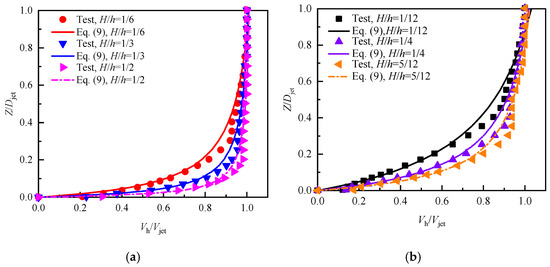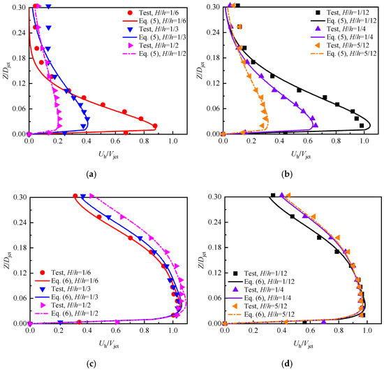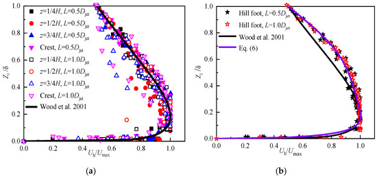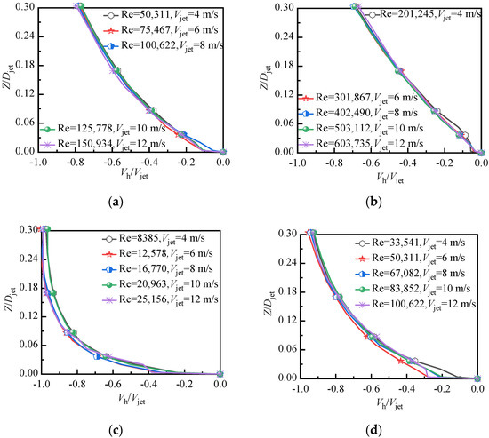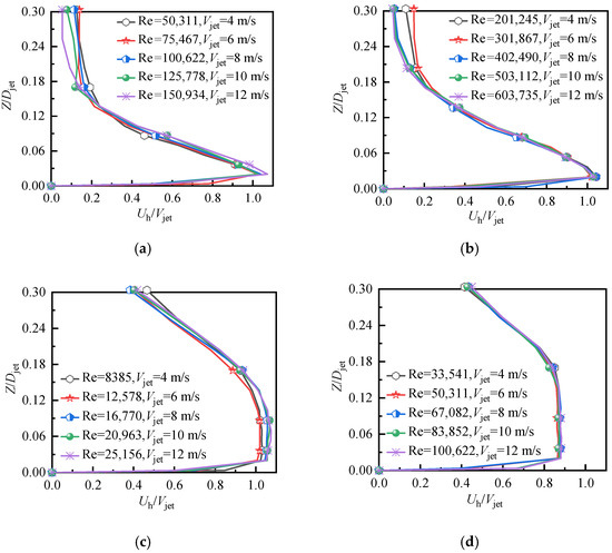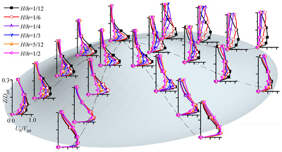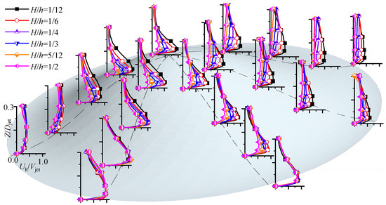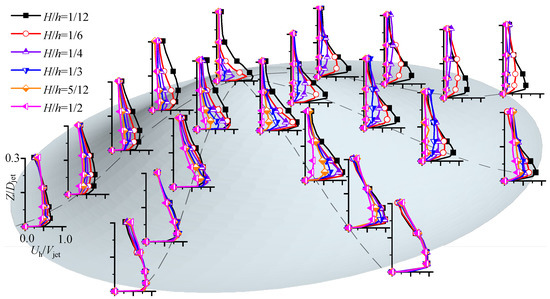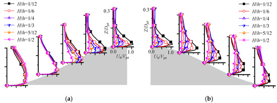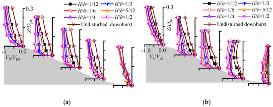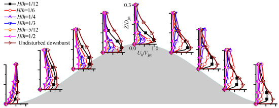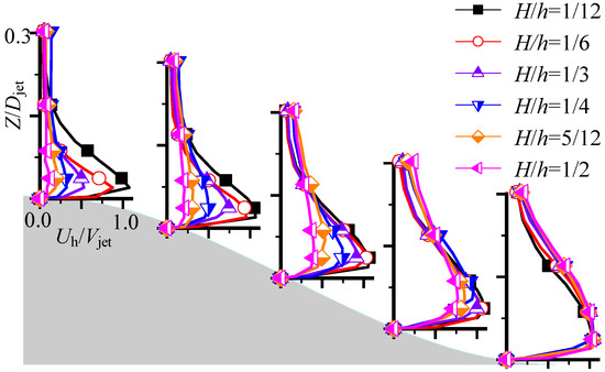 The wind profiles on the y-axis ridge are shown in Figure 8. At the hill foot with a radial distance of roughly r = 1.12Djet, the wind intensity became relatively stronger. The maximum wind velocity at the hill foot was a little greater than the impinging jet velocity. However, regardless of the hill height, the wind profiles measured at the hill foot were generally similar, which implies that the hill height had a negligible effect at this location. For the hills with H/h > 1/6, it was found that the horizontal wind velocity was significantly decreased along the ridge, implying that the blockage effect was pronounced. Furthermore, corresponding with the increase in the hill height, the maximum wind velocity decreased. If H/h ≤ 1/6, the speed-up phenomenon could be observed along the whole ridge, and the maximum topographic multiplier was found at z = H/4 with a value of 1.08Vjet.