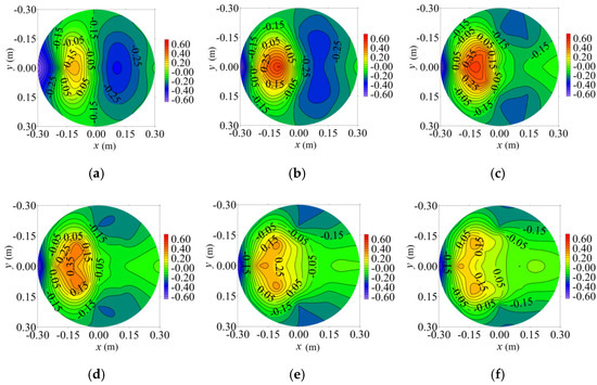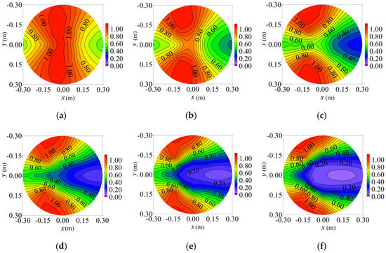 Contour maps of Mt,max for horizontal wind velocity (L = 0.5Djet, rh = 1.0Djet): (a) H/h = 1/12; (b) H/h = 1/6; (c) H/h = 1/4; (d) H/h = 1/3; (e) H/h = 5/12; (f) H/h = 1/2.